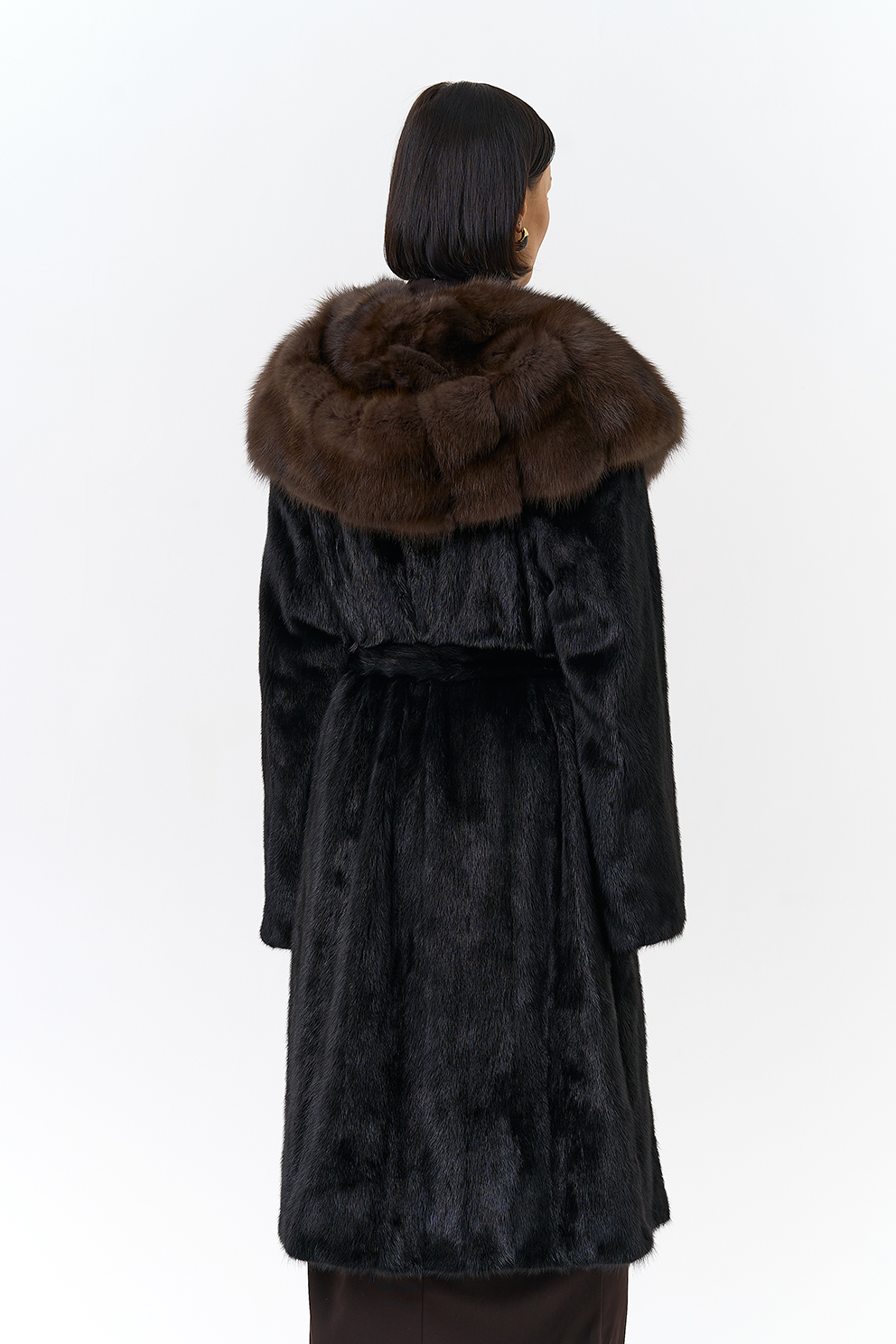 Раскладка меха в роспуск. По талии есть пояс, который моделирует объем изделия.